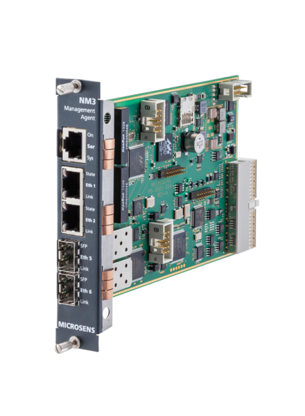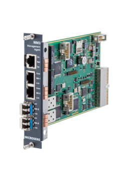 Conformément au concept modulaire de la plateforme MSP 1000, MICROSENS propose également deux variantes pour les modules de gestion de réseau : Le module NM3 avec un switch Gigabit Ethernet à 4 ports occupe un emplacement dans le châssis. Le module NM3+ possède un total de six ports Gigabit Ethernet, un port d'extension USB et deux entrées et sorties numériques flottantes. En raison des interfaces supplémentaires, il occupe deux emplacements de module. Les deux modules peuvent être connectés à une console via un port série RS-232.