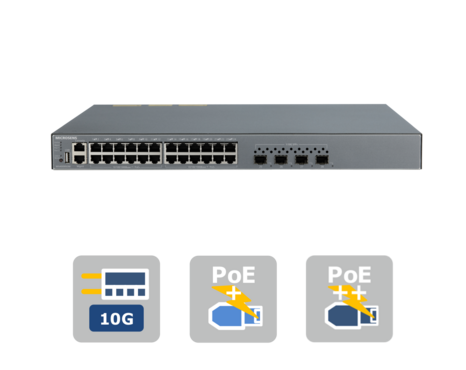 The high-performance 28-port Gigabit Ethernet switch is specially designed for use in networks in which Power-over-Ethernet functionality is used. All 24 10/100/1000Base-T copper ports offer PoE according to IEEE802.3af and IEEE802.3at standards.