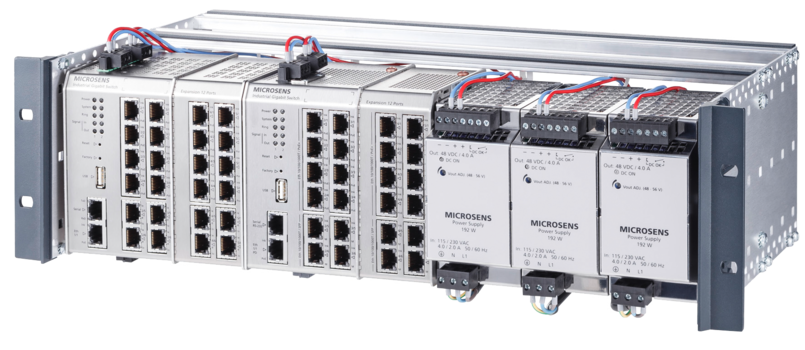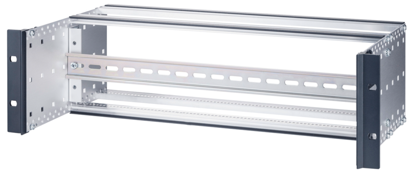 Specjalnie do tego celu firma MICROSENS oferuje odpowiednie aluminiowe obudowy 19" ze zintegrowaną szyną DIN 35 mm. Dzięki temu komponenty przemysłowe mogą być instalowane w szafach 19" bez problemów i prowizorycznych rozwiązań. Solidna obudowa ma wysokość 4 U i dzięki szynie DIN umieszczonej z tyłu oferuje wystarczająco dużo miejsca na przyłącza urządzeń z przodu.